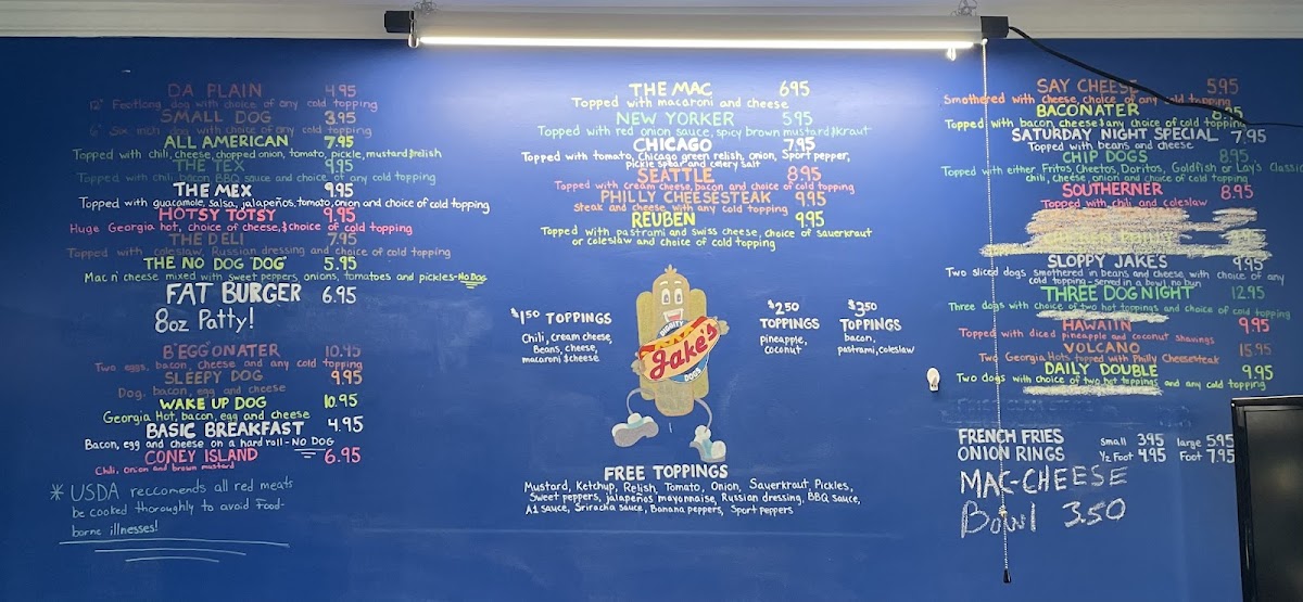 Whether you’re looking for a classic or a quirky twist on your hot dog experience, Jake’s promises flavor and fun in every bite!